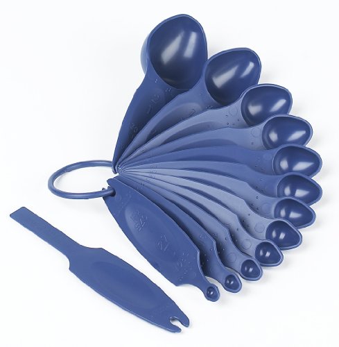 Introducing the Pourfect line of products- the only complete mix, measure and pour set available in the market today to help perfect standard baking gadgets. Made entirely in the USA, Pourfect Products address common frustrations and mishaps in the kitchen to make food preparation easier, more accurate and tidier for anyone. The Pourfect Product line will complement any kitchen's decor and KitchenAid appliances. In addition, the entire line is extremely ergonomic and light-weight, making it easier for people with arthritis and carpal tunnel syndrome to grip them. The Pourfect measuring cups and spoons feature calibrated measurements and bold text in English, Metric and Braille. Each cup has a matte finish, comfort grip with thumb depression, a polished bowl for easy release, and a dripless spout with a fine edge that assures no drips. This 12 piece plus leveler measuring spoon set in blue willow features the following sizes: 1/64, 1/32, 1/16, 1/8, 1/4, 1/3, 1/2, 3/4, 1 teaspoon, 1 Tablespoon, 1-1/2 Tablespoon and 2 Tablespoon. All Pourfect Products are dishwasher and microwave safe.